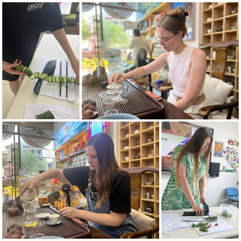 国际教育学院二楼教室的讲台旁,学员们围站成圈,在卢玺如老师示范下切着黄瓜丝,体验中国菜未必需要烈火烹油浓油赤酱,家常小菜让营员们理解了“人间至味是清欢”。转身走进巷尾茶店,霍亚玲老师带营员们坐在泛着温润光泽的木质茶桌旁,看执壶注水,观一芽一叶,学员们模仿着举杯细啜,从舌尖的鲜爽到喉间的回甘。小菜清茗形成奇妙呼应——中国人的生活热情,就藏在这看似平淡的清雅之间。