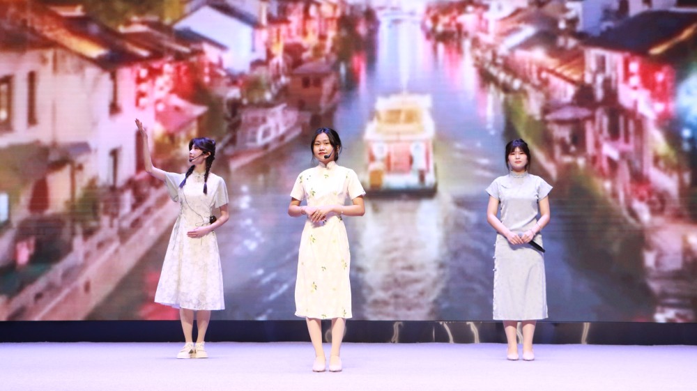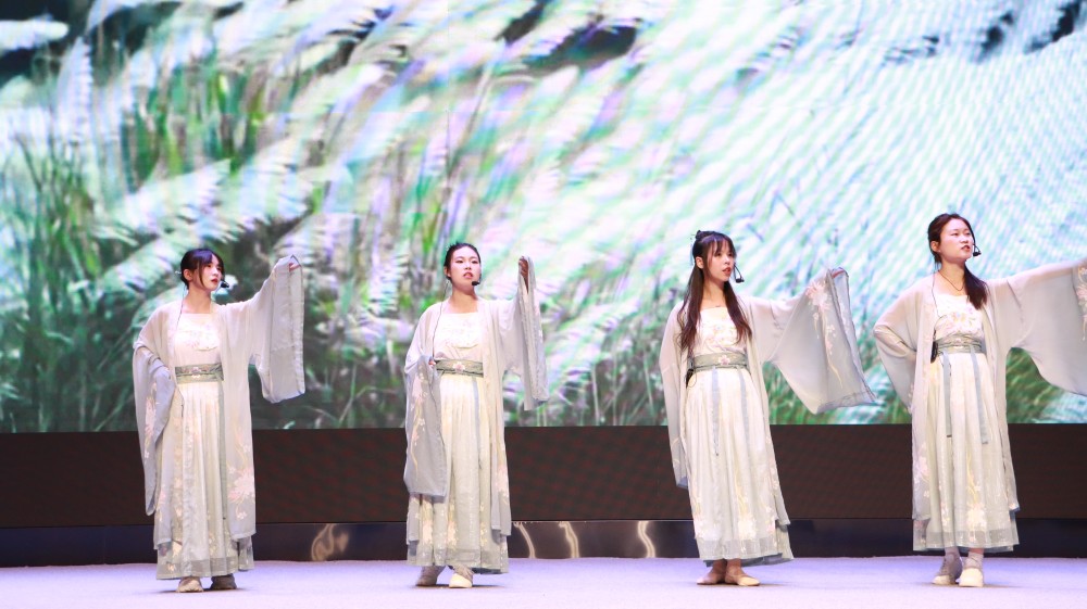 比赛现场,各国学子以诗为媒,跨越语言与文化的藩篱。苏丹学生叶小云与中国学生手持油纸伞,在朦胧光影中低吟戴望舒的《雨巷》,重现江南烟雨的缠绵意境;缅甸学生洪萩玲与中国搭档身着旗袍朗诵《月光下的中国》,大屏幕上灯火里中国的壮美景色与优美的诗句相互呼应;泰国学生叶丽莎、越南学生明英与中国学生着汉唐霓裳共吟《蒹葭》,箜篌乐声中,“溯游从之”的追寻跨越时空回响……