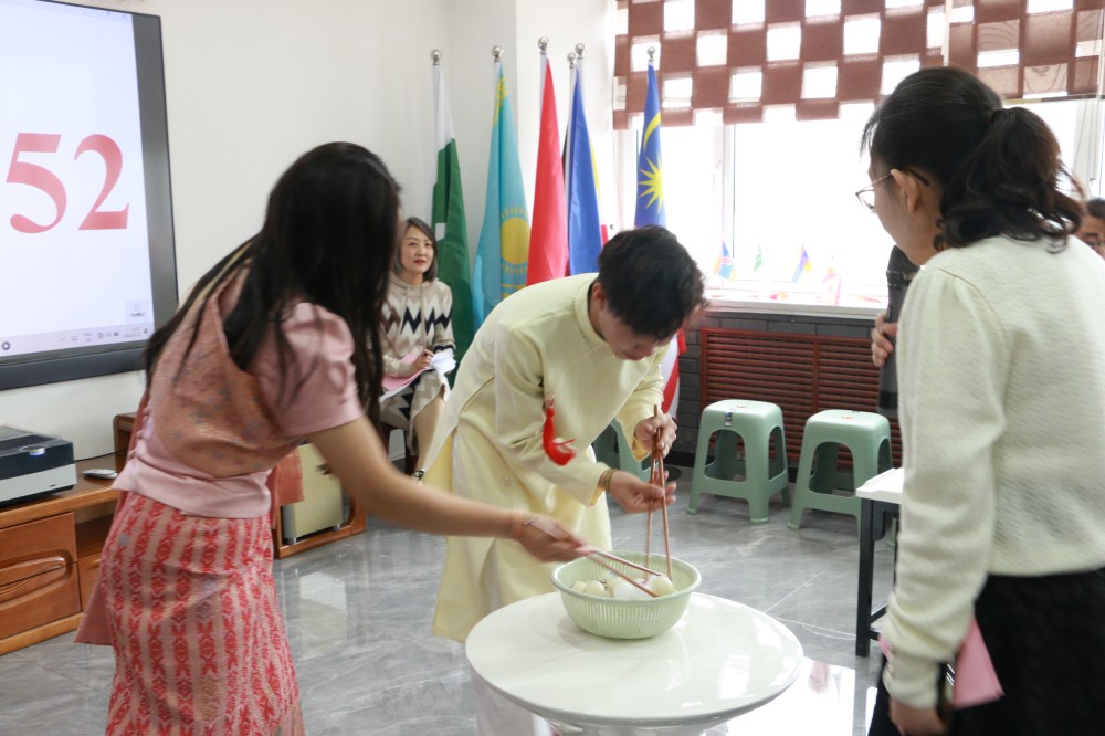 互动游戏环节将活动推向高潮。我校国际学生代表在“猜国别”游戏中配合默契,通过肢体语言生动演绎东南亚各国的文化符号;在“筷子夹乒乓球”比赛中,学生们展示了娴熟的技巧,与其他高校师生友好竞技,现场气氛热烈欢快。