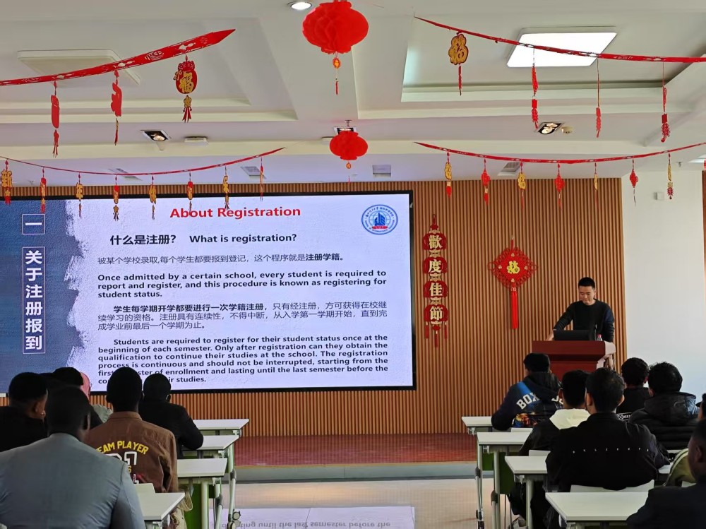 会议伊始,国际教育学院辅导员曹超围绕“留学兰理工”,为语言生新生系统讲解了签证与居留管理、安全与应急措施、文化习俗与法律法规、学院制度与学业要求等关键事项。