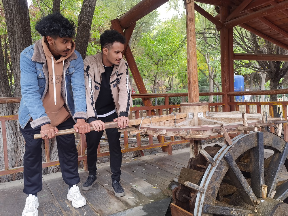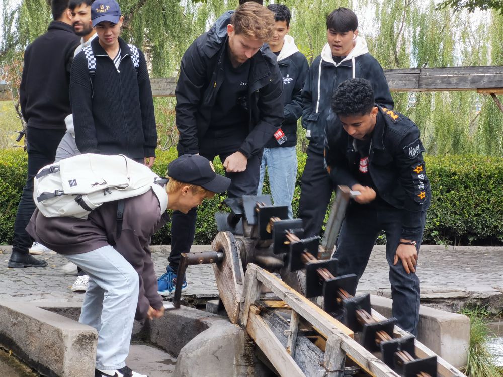 活动首站,国际学生们来到了水车博览园里,古老的水车缓缓转动,发出吱呀吱呀的声响。国际学生们好奇地观察着水车的构造和运作原理,亲身操作水车取水的过程,深刻感受着中国人民的勤劳与智慧。