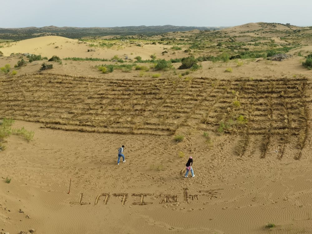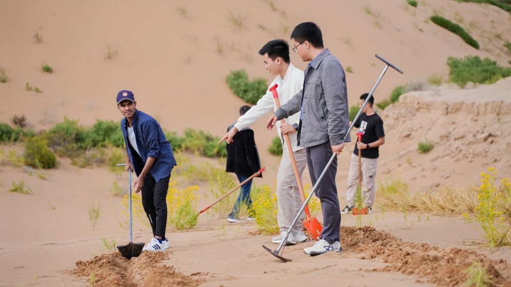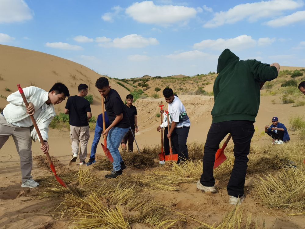 揭牌仪式后,来华留学生们怀着崇敬之情参观了“六老汉”治沙纪念馆和八步沙两山实践创新展示中心。一份份泛黄的文件资料、一幅幅珍贵的历史照片、一段段感人的治沙故事,让他们深刻领略到了八步沙林场治沙人的新时代愚公精神和不畏困难、艰苦奋斗的家国情怀和担当精神。随后,来华留学生们拿起工具,积极参与草方格压沙志愿服务活动,他们挖沟槽、铺稻草、压草方格,亲身体验治沙的艰辛与成就。