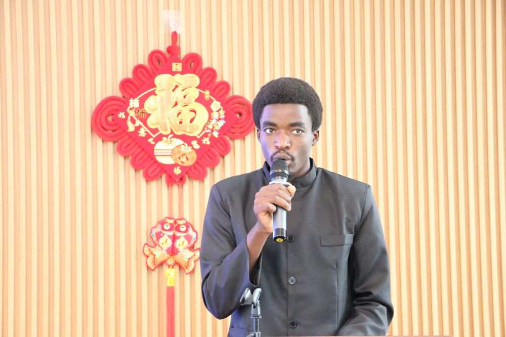 初级三班的学生代表、来自刚果(金)的张宏睿(MWEHU BANZA SAMSON)分享了自己在学习汉语过程中的收获和感悟,感谢学院领导和老师们的悉心栽培。他讲述了自己从初来乍到文时的不懂汉语,到现如今能够用汉语自如交流的点滴故事,通过汉语学习打开了了解丰富多彩中华文化的大门。