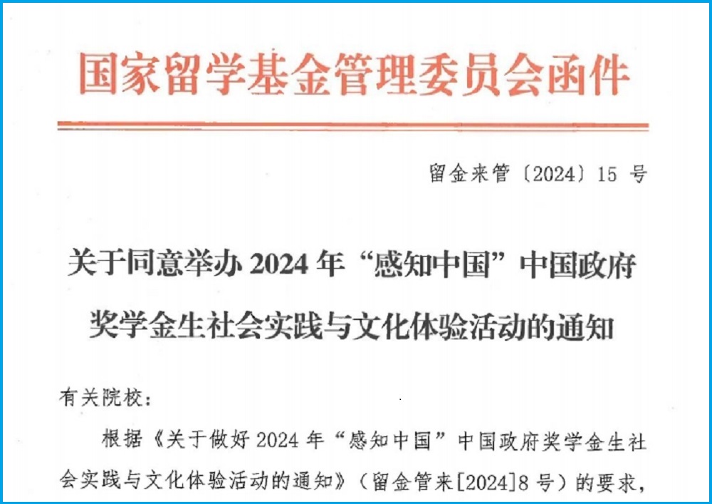 近日,国家留学基金管理委员会发布《关于同意举办2024年“感知中国”中国政府奖学金生社会实践与文化体验活动的通知》(留金来管〔2024〕15 号),我校《“一带一路”助力弘扬丝路文明》《体验生态文明成果,走好乡村振兴之路》2项活动获得批准,同意2项活动由国家留学基金管理委员会主办、我校承办并冠名“感知中国”。