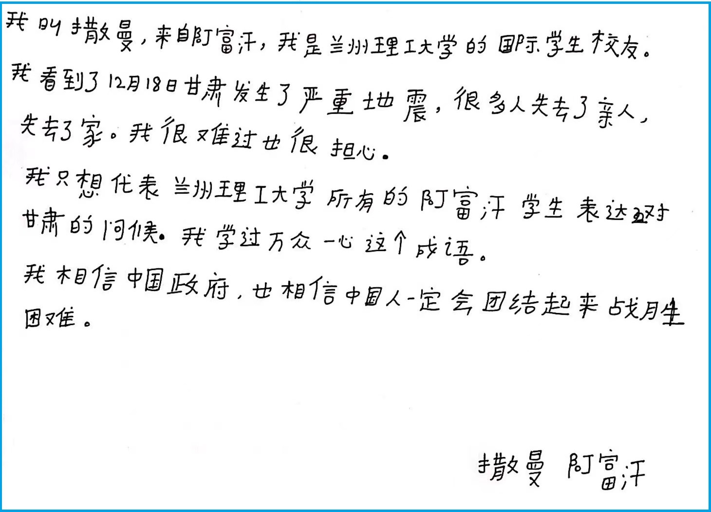 阿富汗、埃及、俄罗斯、哈萨克斯坦、吉尔吉斯斯坦、加纳、肯尼亚、老挝、苏丹、也门和越南等国家的来华留学校友得知消息后,自发通过慰问信转达对灾区人民的慰问。他们感谢中国政府、甘肃省政府和学校在他们留学期间给予的关心关爱和大力帮助,并对地震救灾工作表示支持。(图片:校友、潘迪;撰稿:崔丽红;终审:王春梅)