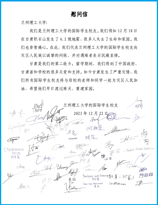 一方有难,八方支援。2023年12月18日,发生在甘肃省临夏州积石山的6.2级地震,对生命财产造成一定损伤。灾区救援工作牵动着远在世界各地的来华留学校友和在校国际学生的心。他们通过慰问信、筹集物资等方式为灾区人民加油,希望他们早日渡过难关。