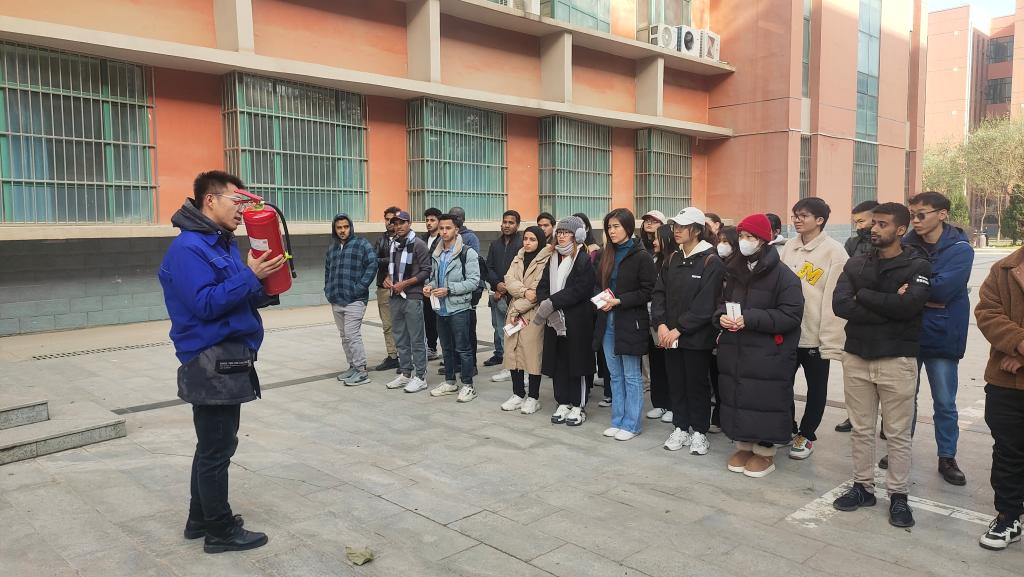 工作人员为国际学生深入讲解了火灾应对知识,详细介绍了各种灭火器的用法、常见火情处置方式,开展了模拟疏散逃生演练。随后,在专业人员的指导下,国际学生进行了模拟火情疏散逃生演练、灭火实操训练。