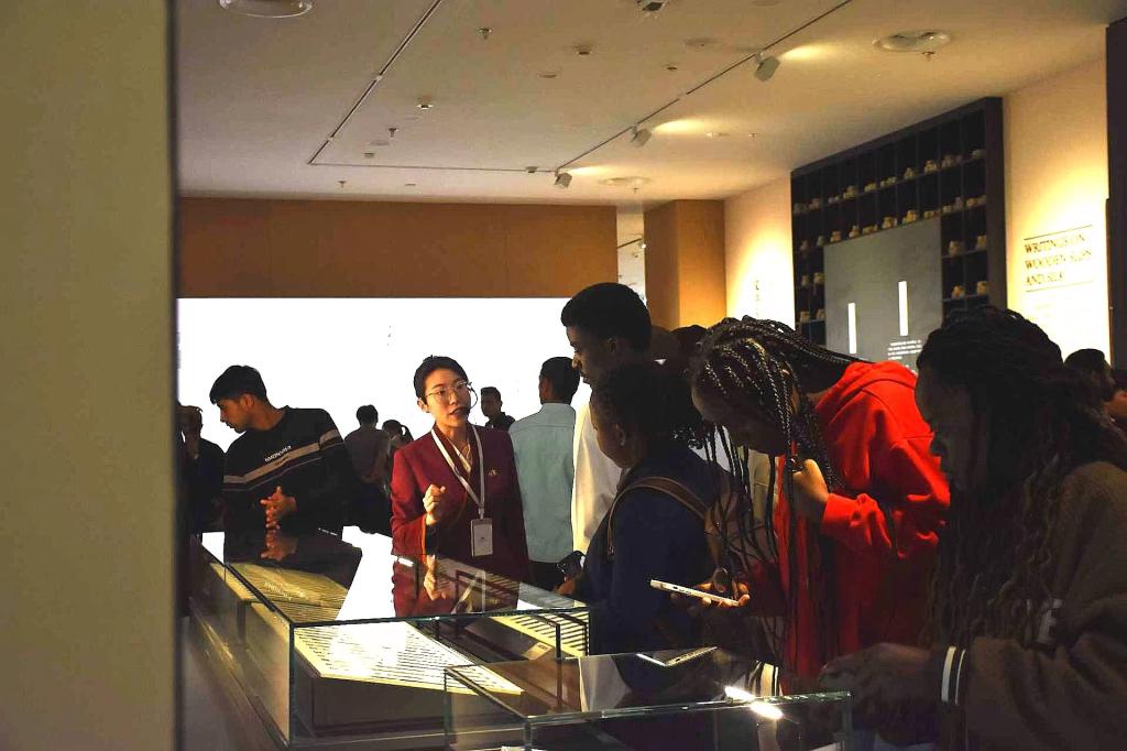 在活动过程中,国际学生参观了“简牍时代”“简述丝路”“边塞人家”“书写简帛”四大展馆。通过实物展示、图文解说、影像互动、场景复原等展示手段,为国际学生全面、生动地展现甘肃简牍里的丝路文化与中华智慧。