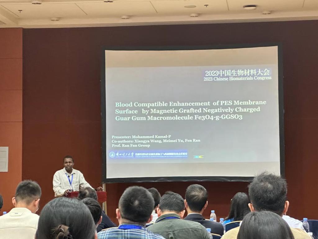 2023年10月12日-15日,由中国生物材料学会(CSBI)主办,重庆大学承办的“2023中国生物材料大会(CSB 2023)”在重庆悦来国际会议中心举行。我校材料科学与工程学院来华留学博士研究生水云山(MOHAMMED KAMAL HADI AHMED)投递的论文摘要被大会采纳,并在大会上作了“Blood Compatible Enhancement of PES Membrane Surface by Magnetic Grafted Negatively Charged Guar Gum Macromolecule Fe3O4-g-GGSO3”专题报告。(撰稿:王亚兵;终审:王春梅)