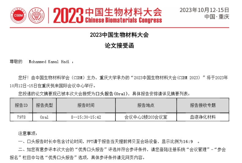 2023中国生物材料大会论文接受函