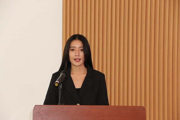 2021级通信与信息系统专业、卢旺达籍硕士研究生田文(MUHIRWA GAD)代表在校学生发言,他感谢中国政府和学校提供的学习机会,分享了两年多学习生活的感受,并建议新同学要积极参加文化及学术活动,多与中外朋友交流,通过沟通快速提升汉语应用能力;要珍惜学校提供的学习平台,认真完成课堂作业;要尽量多遨游在图书馆的海洋,拓宽人文知识的广度和专业知识的深度;要严格遵守学校的规章制度、中国的法律法规,保障自身安全。2023级会计学专业、老挝籍硕士研究生孟英爱(MEUNSUPHOM INAOY)代表全体新生发言,她结合自己本科学习的感受,对比了通过媒体了解的中国和真实感受的中国形象,并代表全体新生承诺将认真学习,收获知识,严格要求,遵规守纪,加强交流,共同建设和维护好美丽校园。