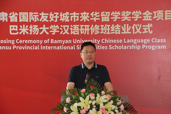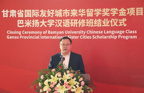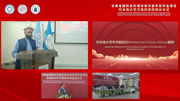 王全进副校长感谢省外办、省对外友协对项目的精心指导和大力支持,并对巴米扬大学师生学员努力克服重重困难,积极参与学习交流、中国文化讲座,顺利结业表示祝贺。他指出,巴米扬省与甘肃省在古丝绸之路时代就有密切联系,本期汉语研修班的顺利举办不仅是两校之间务实合作的一次重要实践,更是甘肃省与巴米扬省友好城市之间友谊的有力传承。他期望全体学员持续关注和推动两省、两校合作,做好中阿两国友好往来的友谊使者和合作桥梁。