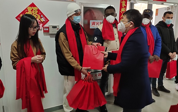 来华留学生感谢学校的关爱,老挝籍来华留学生夏姆(SOYPHOMMACHANH BAIPHOD)与领导们亲切交流,分享他对中国传统节日春节的认识和在中国留学过程中的过年体验,他感谢学校领导、老师们每年除夕组织在校学生春节慰问活动,让在他们也能感受到家一样的温暖团圆和关心关怀。(撰稿:王亚兵;终审:李德顺)