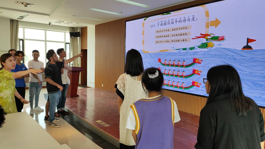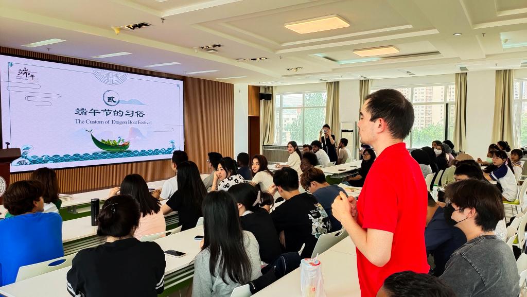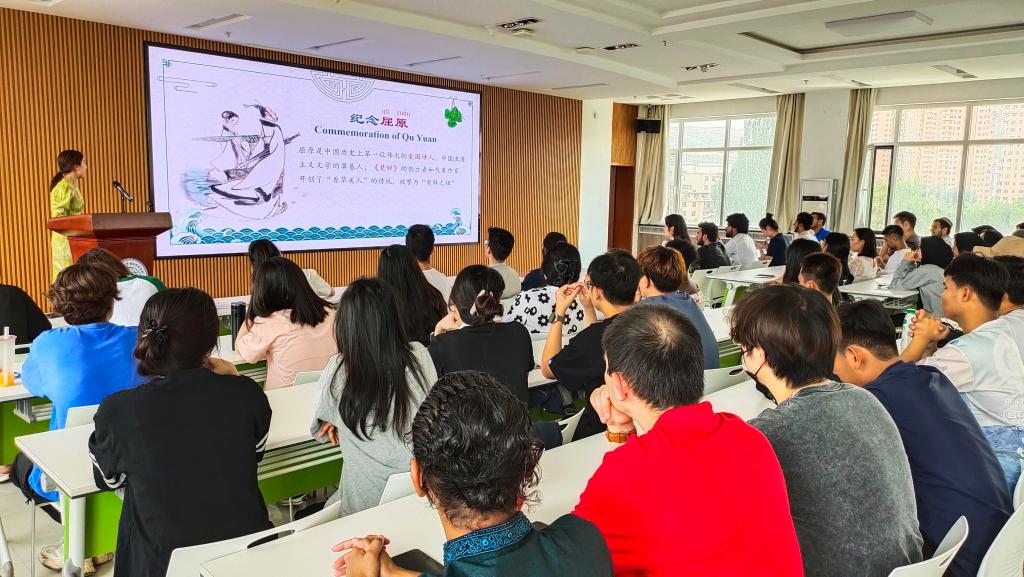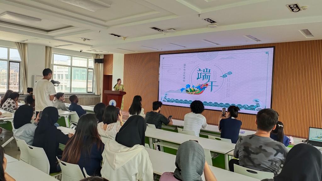 活动中,学院汉语老师李潇首先向国际学生详细讲解了端午节的历史渊源以及相关的风俗习惯,用通俗易懂的方式使国际学生对端午节有了更深的了解,来自乌兹别克斯坦的阿真汉说:“通过老师对端午节的知识讲解,我了解到屈原、粽子和中国人的爱国精神,也知道了端午节问候要说‘端午安康’,而不是‘端午快乐’。