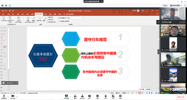 教育活动中,学生工作办公室主任张磊就本学期在校国际学生学习生活表现、疫情防控情况分别进行了总结,强调了校规校纪纪律要求及疫情防控管理规定,对假期疫情防控、值班安排、交通安全、用电安全、预防电信诈骗、紧急就医、非法就业及处罚等方面进行了详细解读,对假期学生每日健康打卡、外出请销假制度、核酸检测等工作提出了明确要求。