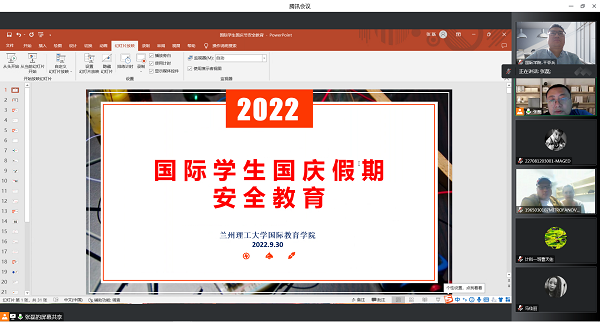 2022年9月30日下午,为进一步做好2022年国庆节放假期间国际学生管理服务工作,维护安全稳定,学院组织在校国际学生开展了国庆节假期安全教育活动,国际学生辅导员及全体在校国际学生参加教育活动。
