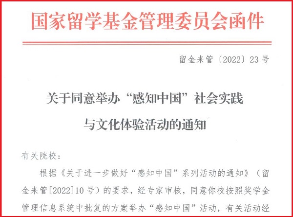 近日,国家留学基金管理委员会公布“感知中国”文化体验暨社会实践活动获批项目名单。经过学校申报、专家初评、修改完善、专家终评等环节,我校《感知中国——传承丝路精神,助力“一带一路”建设》《感知中国——新时代西部乡村振兴之路》两项活动获批冠名“感知中国”,由国家留学基金管理委员会主办、我校承办开展。(撰稿:王亚兵;终审:李德顺)