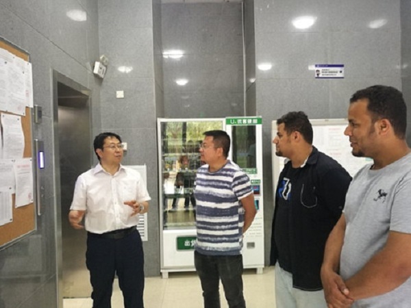 夏天东书记与学院值班教师及国际学生交流 2018年6月2日下午,学校党委书记夏天东检查学院安全稳定工作。学校保卫处处长李仕国陪同检查。 夏书记先后检查了国际学生公寓秩序、学院值班安排与落实情况并与国际学生进行了亲切交谈。夏书记强调,要进一步关注、关心、关爱国际学生,大力加强和开展引导、管理和服务工作,确保国际学生安全和秩序稳定;要深入开展安全隐患排查,按照党政同责要求,逐项督促落实整改,为国际学生学习、生活提供良好的环境;严格执行节假日值班和毕业生文明离校工作,帮助国际学生解决困难,确保国际学生文明离校。