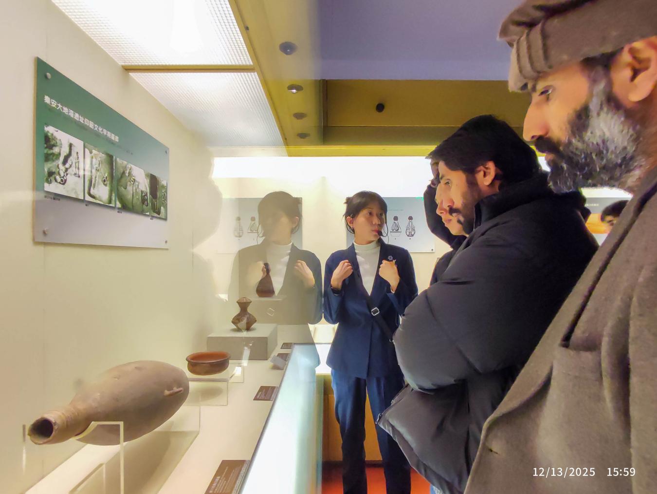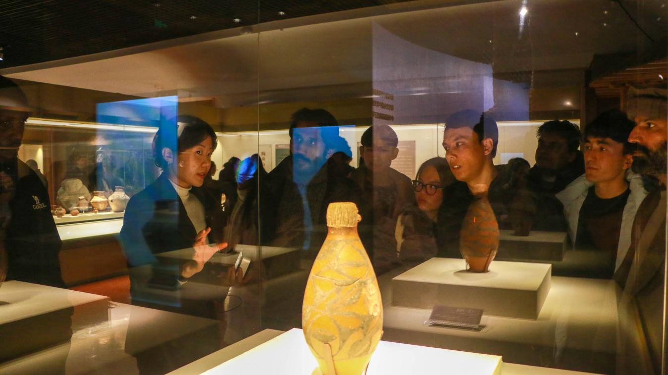 在博物馆讲解员带领下,学生们循着历史脉络沉浸式参观。“甘肃彩陶” 展厅中,5500 年前的人头形器口彩陶瓶让来自巴基斯坦安妮惊叹:“史前先民的技艺堪称艺术奇迹!”“丝绸之路文明” 展厅内,铜奔马三足腾空的灵动姿态震撼全场,来自阿富汗的奕辰感慨:“亲眼见到铜奔马,才懂古代工匠的智慧。”
