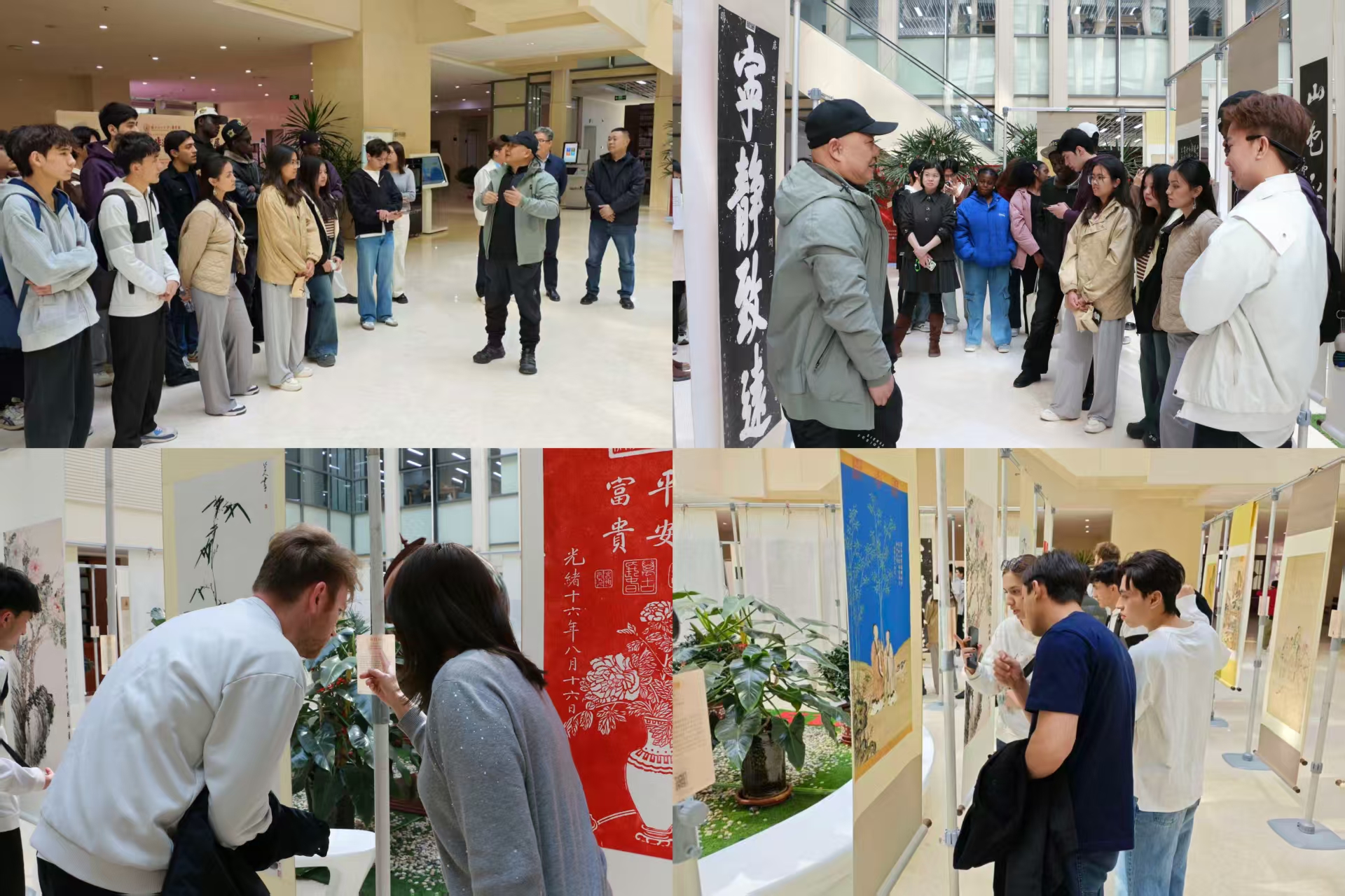 参观现场,国际学生认真聆听讲解,不时驻足观赏,近距离感受品味书画的笔墨韵味,主动提问交流。
