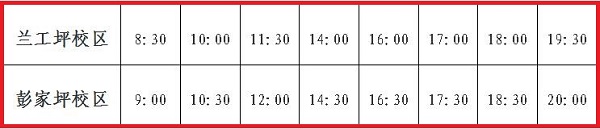 要求:1.乘车点:兰工坪校区为10号楼前;彭家坪校区为西大门;2.乘车人员请佩戴口罩,有序乘车;3.两校区通行,建议同学们乘坐校车。