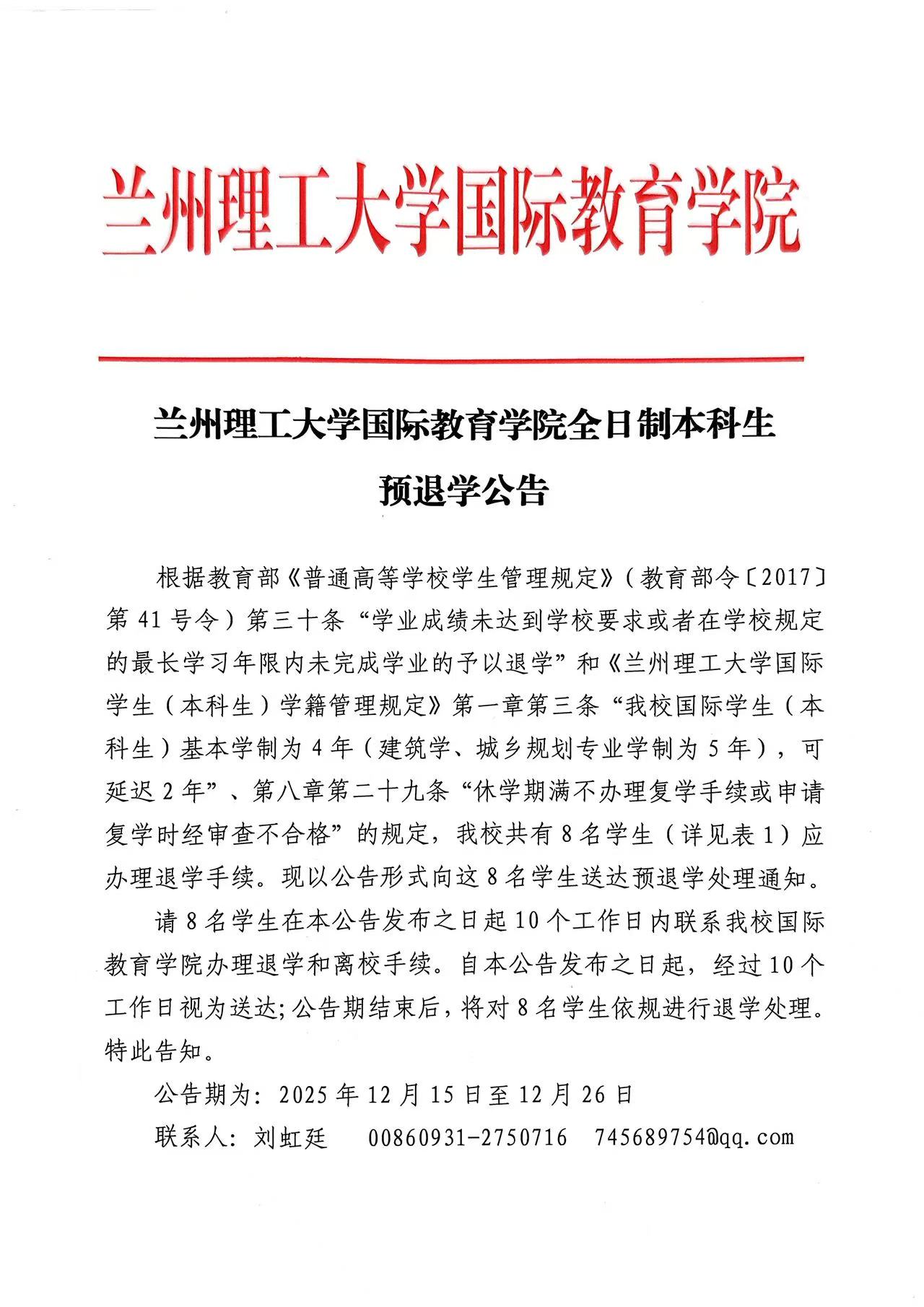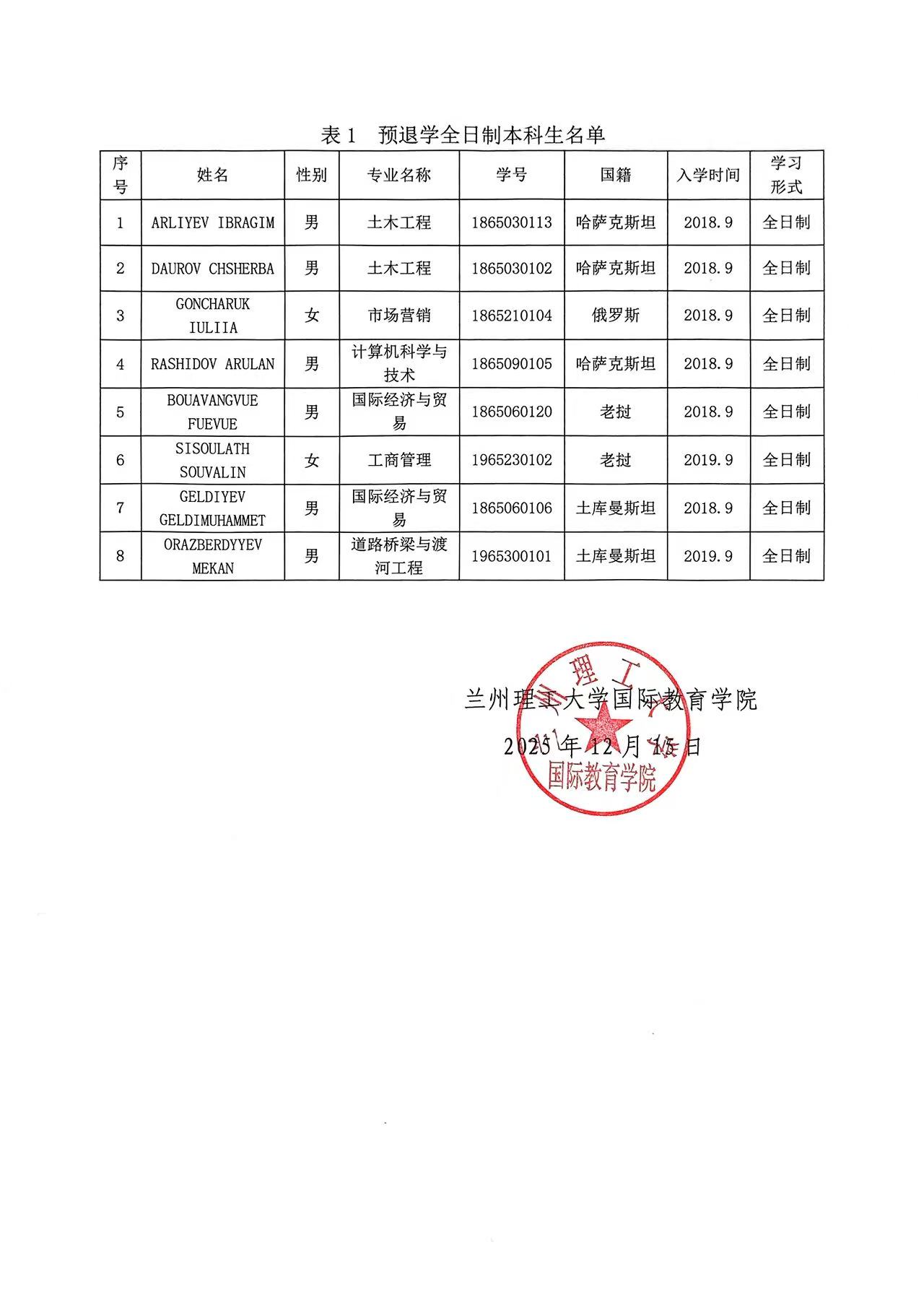 兰州理工大学国际教育学院全日制本科生预退学公告