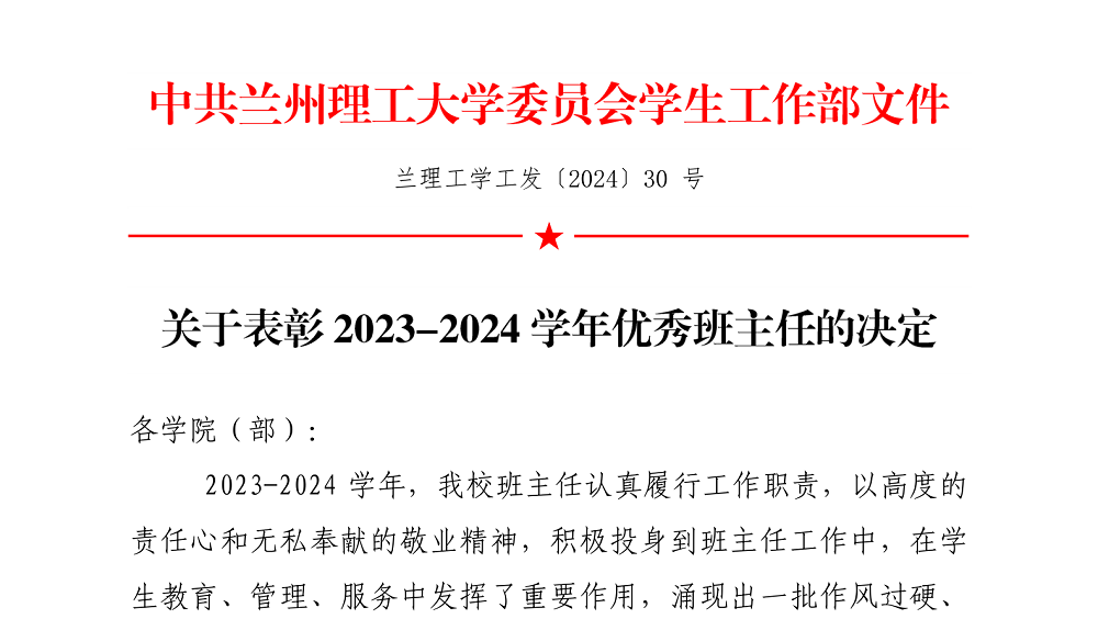 2024年11月14日,学校党委学生工作部发布《关于表彰2023-2024学年优秀班主任的决定》,我院曹超同志荣获2023-2024学年“优秀班主任”。曹超同志事迹材料如下: