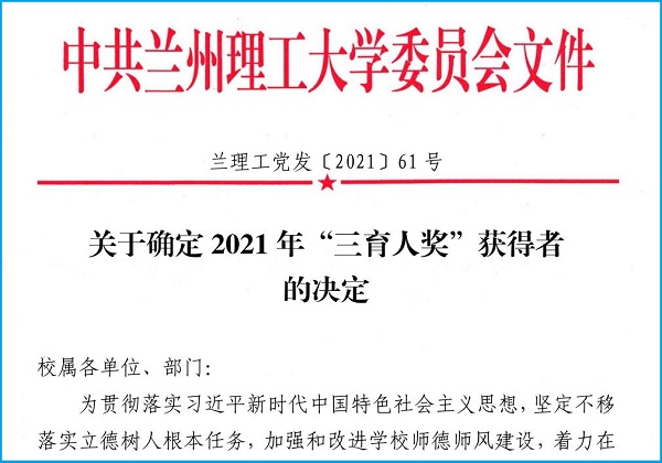 2021年9月,学校发布《关于确定2021年“三育人奖”获得者的决定》(兰理工党发〔2021〕61号),我院崔丽红同志荣获2021年“三育人奖”先进个人。
