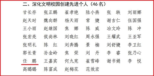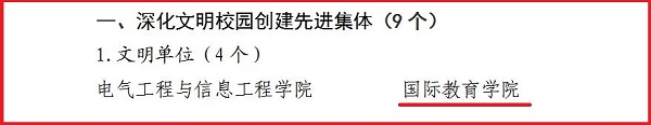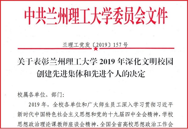 2019年12月,学校发布《关于表彰2019年深化文明校园创建先进集体及先进个人的通知》(兰理工党发〔2019〕157号),经学院申报、学校检查小组现场检查评分,国际教育学院荣获2019年深化文明校园创建“文明单位”,学院直属党支部书记、副院长任鹏荣获“深化文明校园创建先进个人”荣誉称号。